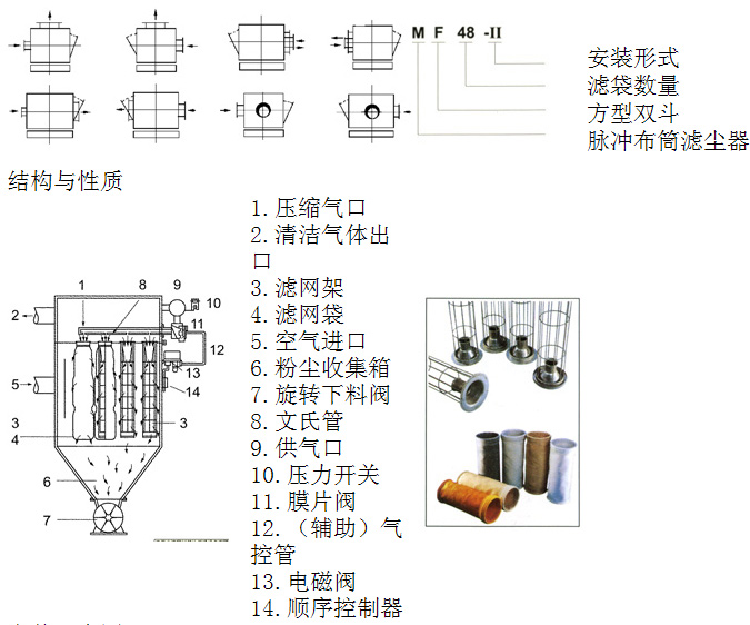 MF系列脈沖布筒濾塵器的詳細資料:積附在濾袋外壁的粉塵不斷增加。當阻力在限定(一般為80-120毫米水柱)的范圍內,就要清除積附在濾袋外壁的粉塵,清灰是由控制儀定期順序觸發各控制閥,開啟脈沖閥,使氣包內的壓縮空氣由噴吹管孔噴出(一次風)通過文氏管誘導數倍于一次風的周圍空氣(二次風)進入濾袋,使濾袋在一瞬間急劇膨脹并伴隨著氣流的反向作用,被抖落的粉塵落入灰門經排灰閥排出機體。
