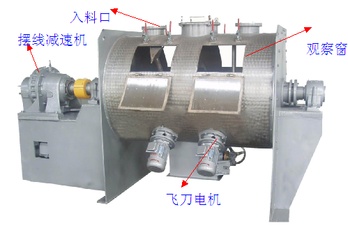 臥式犁刀混合機啟動后犁刀由犁刀軸帶動旋轉,使物料沿筒體徑向作周向湍動,同時把物料沿犁刀兩側面的法線方向拋出。當被拋出和作周向湍動的物料流經飛刀組時,被高速旋轉的飛刀迅速、有力地拋散。物料在上述犁刀和飛刀的復合作用下,不斷疊、擴散、在短時間內達到均勻混合,混合精度高。
